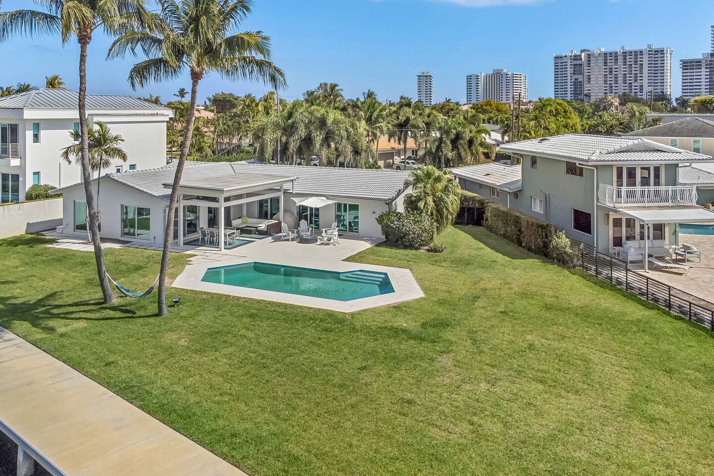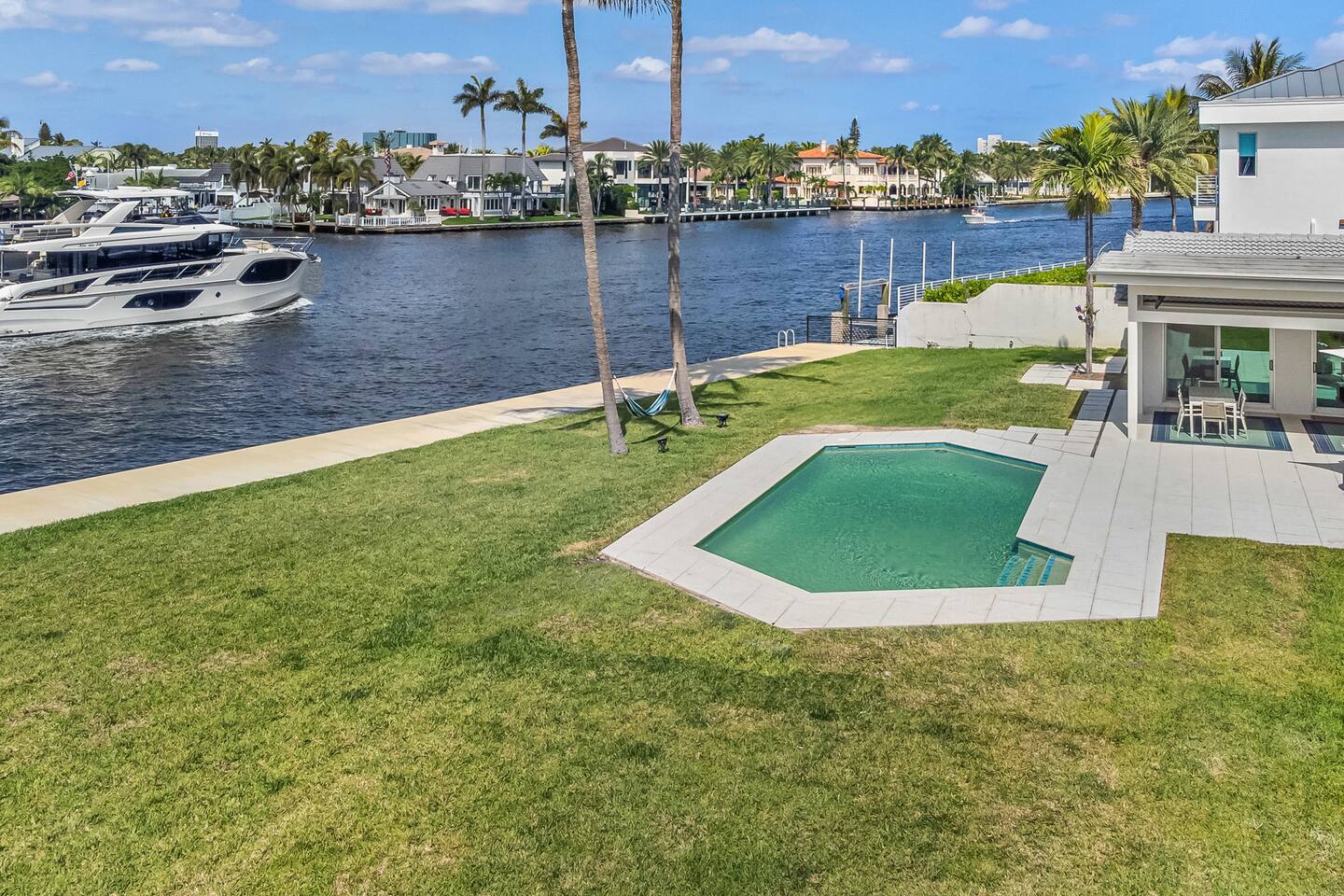 One of a kind direct waterfront smart home! Views onto the intracoastal from every room! Step outside and relax by the saltwater pool or grill and serve fresh dinner right on the patio! Downtown & Las Olas just 6 miles away, or plenty of local shops just outside our gated neighborhood! Panoramic backyard with tons of grass space and pool. Surrounded by lounge style seating, TV, firepit, grill and plenty of other seating! Backyard has sunny southwest exposure. Deeded access to beach 1/2 mile away