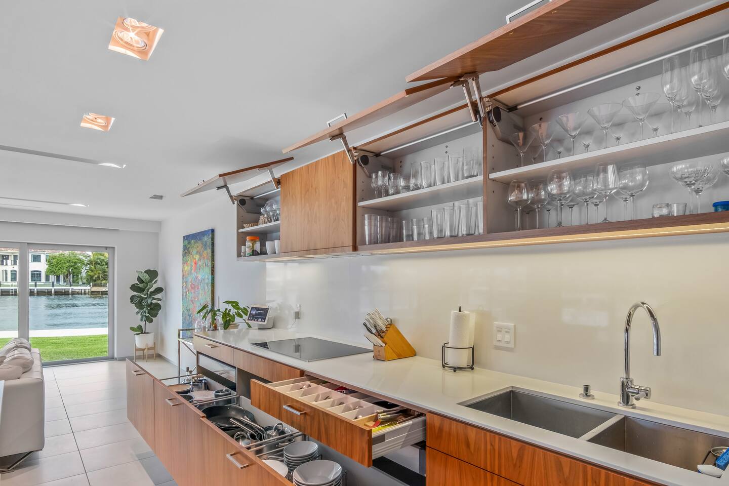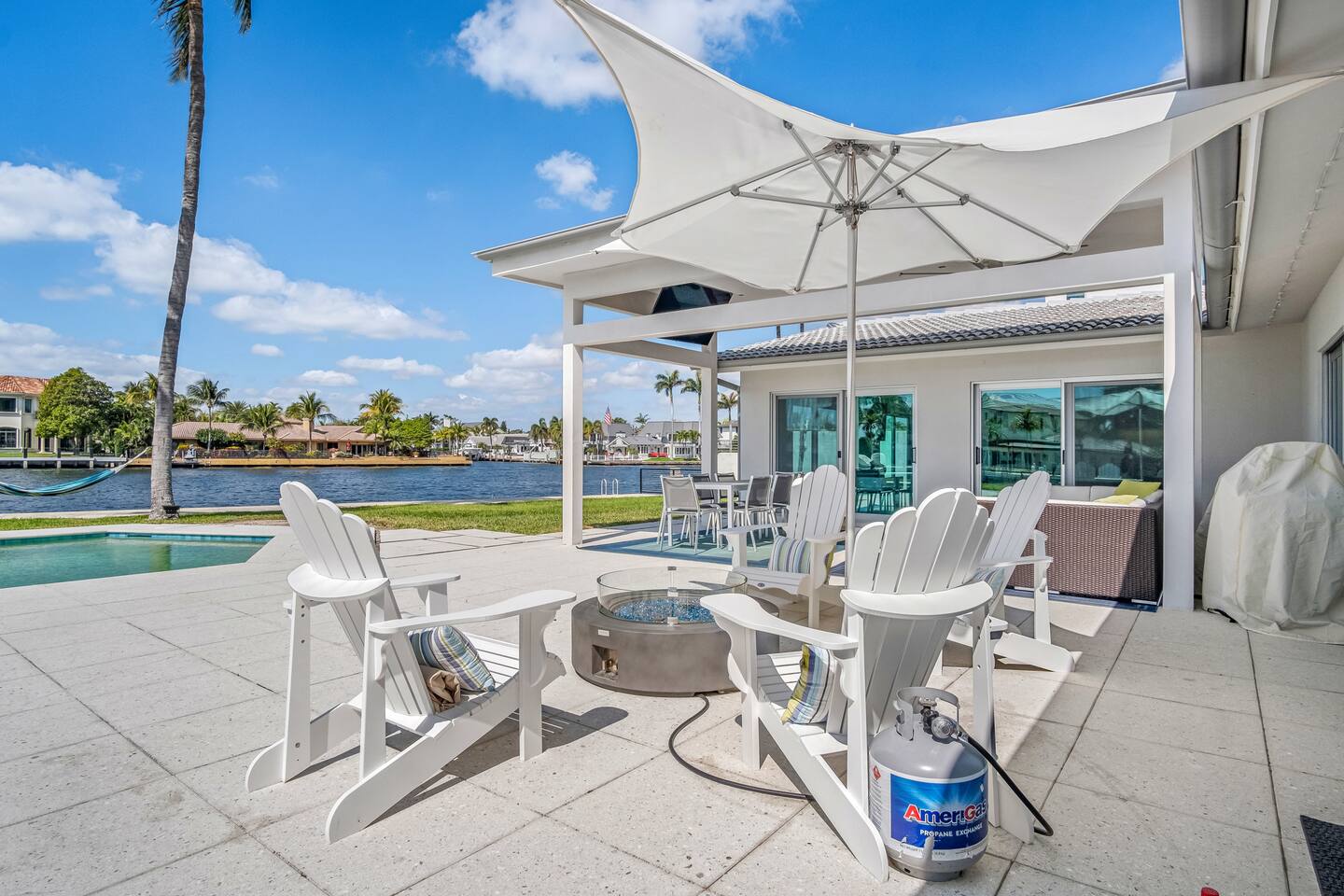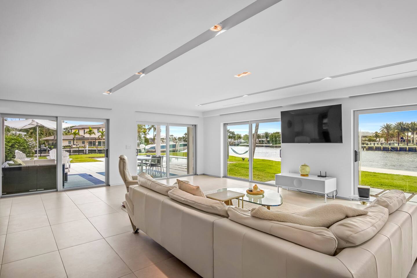 Directly on main intracoastal!! Watch as the yachts cruise by! European inspired Modern one-story home with 3 bedrooms and 2 bathrooms. Intracoastal views from every single room or remote controlled blackout blinds for every single window and sliders! Backyard has southern exposure offering sun throughout the whole day! Catch shade under the awning with comfortable sectional lounge seating and a 65 inch TV, firepit, grill, and outdoor dining. - Private, gated, luxury waterfront community of Bermuda Riviera - 181 feet of waterfrontage - Tons of grass space - 2 car garage and driveway - Walk to the beach (deeded private) - Downtown and world class shopping within 6 miles - Golf cart use $50 per day + $500 deposit (rental must be for the duration of your stay)